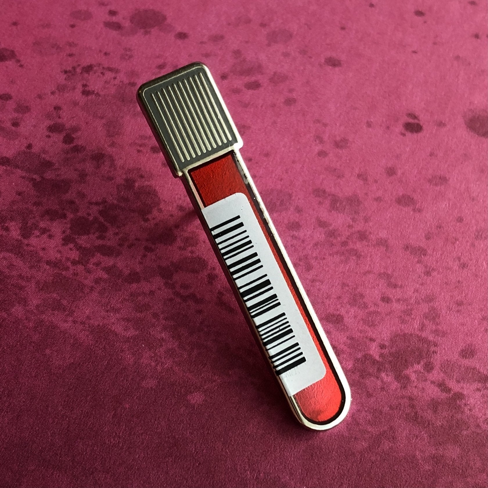 This hard enamel pin is cast from silver nickel and filled with colored and transparent enamel with screen-printed details.